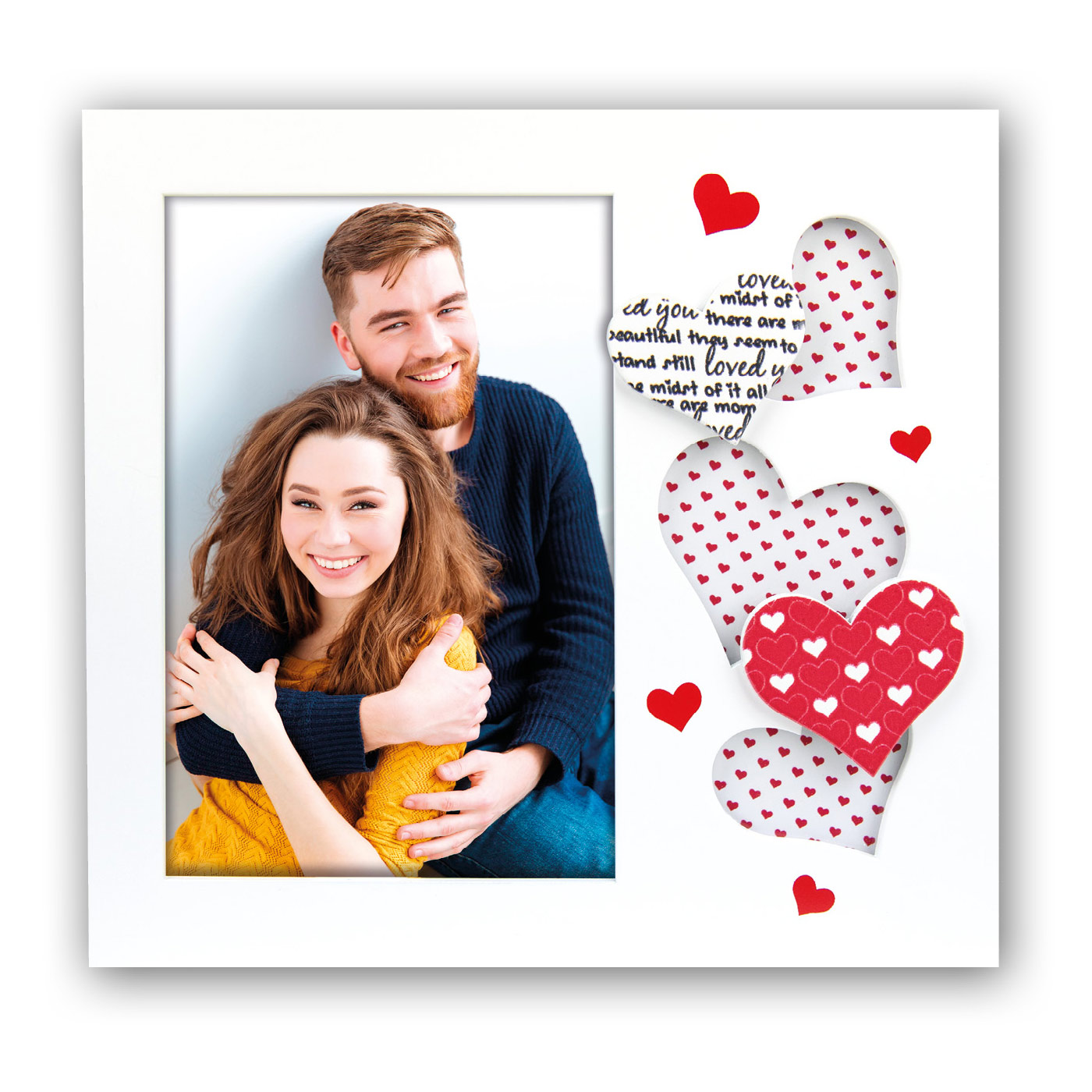 Cornice Arisa in legno, colore bianco, con stampa decorativa colorata, con decoro a forma di cuore in 3D, da tavolo, adatta al tema dell’amore.